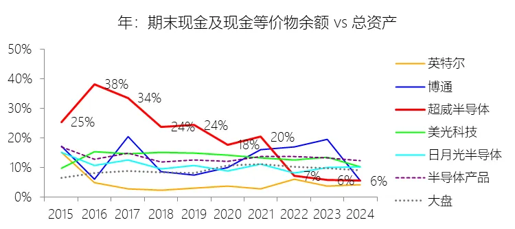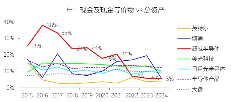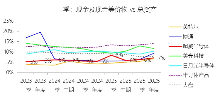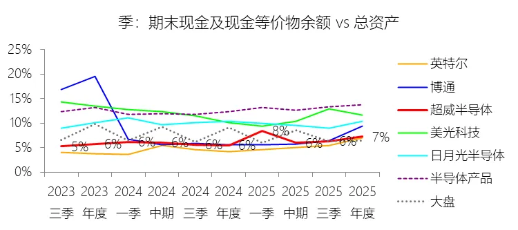 期末现金及现金等价物余额:2025年末,超威半导体的期末现金及现金等价物余额为55.56亿美元,对比年初增长45.79%,与总资产的比例为7.22%,同比上升1.72个百分点;2015-2024年(十年),此项合计为225.04亿美元,平均比例为9.13%,比半导体产品行业的均值低4.13个百分点,长期呈下降趋势。