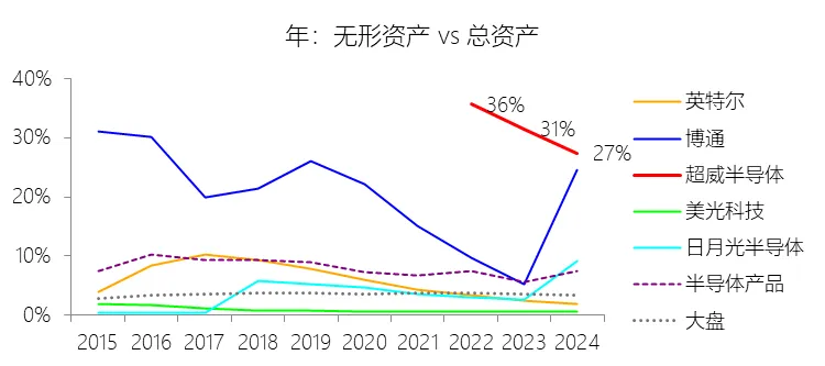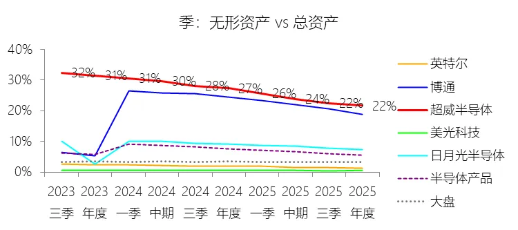 无形资产:2025年末,超威半导体的无形资产为167.05亿美元,对比年初减少11.75%,与总资产的比例为21.72%,同比下降5.63个百分点;2015-2024年(十年),此项合计为644.11亿美元,平均比例为26.12%,比半导体产品行业的均值高18.44个百分点,长期呈下降趋势。比例短期下降主要由于公司并购产生的无形资产在2025年计提了高达23亿美元的年度摊销费用,导致无形资产净值从年初的189.3亿美元自然缩减至167.05亿美元;同时,2025年4月有约1.62亿美元的进程中研发(IPR&D)因达到技术可行性而转入已开发技术并开始计提摊销,进一步加速了账面价值的减少;此外,2025年公司总资产在强劲盈利带来的现金储备及为支持AI产品量产而增加的库存储备驱动下增长了11.12%,分母端的快速扩张显著稀释了无形资产的占比。比例长期下降主要由于公司在2022年完成赛灵思(Xilinx)等重大收购后,确认的巨额有限寿命无形资产(如已开发技术和客户关系)进入了大规模的年度摊销周期,摊销金额随时间推移持续冲减资产账面值;且随着公司成功转型并实现持续盈利,由经营活动产生的流动资产(如现金、应收账款和存货)的有机增长速度快于无形资产的更新速度,导致无形资产在总资产中的相对权重逐步回归。比例高于半导体产品行业的均值主要由于公司在2022年完成了半导体行业历史上规模最大的赛灵思收购案,一次性确认了高达273.08亿美元的辨认无形资产,构成了庞大的资产底盘;同时,作为采用代工模式(Fabless)的半导体企业,AMD无需像英特尔等IDM模式竞争对手那样维持极其庞大的晶圆厂物业、厂房及设备资产,其固定资产占总资产比重长期仅约为3%(英特尔同期约为50%),这种轻资产的资产结构使得以技术和品牌价值为主的无形资产在AMD资产负债表中的占比显得远高于行业平均水平。