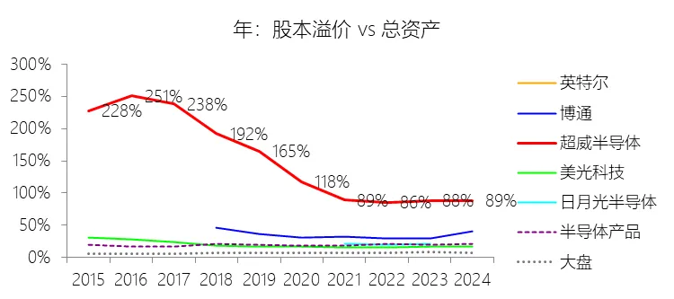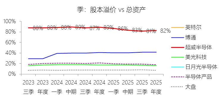 股本溢价:2025年末,超威半导体的股本溢价为633.65亿美元,对比年初增长3.26%,与总资产的比例为82.37%,同比下降6.27个百分点;2015-2024年(十年),此项合计为2431.84亿美元,平均比例为98.61%,比半导体产品行业的均值高78.97个百分点,长期呈下降趋势。