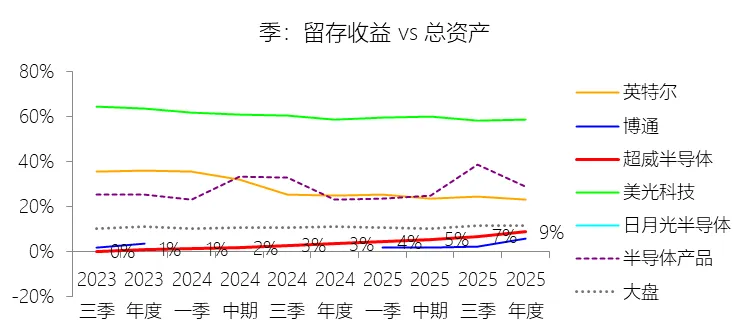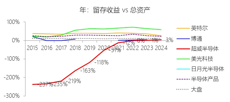 留存收益:2025年末,超威半导体的留存收益为66.99亿美元,对比年初增长183.38%,与总资产的比例为8.71%,同比上升5.29个百分点;2015-2024年(十年),此项合计为-405.15亿美元,平均比例为-16.43%,比半导体产品行业的均值低42.73个百分点,长期呈上升趋势。