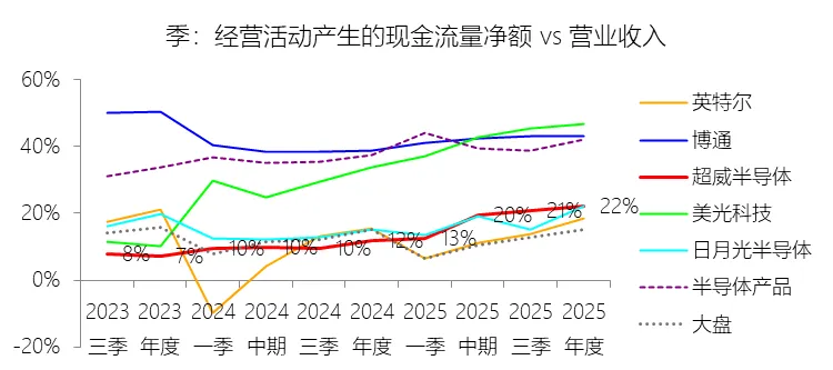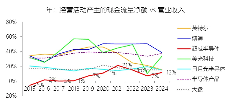 经营活动产生的现金流量净额:2025年,超威半导体的经营活动产生的现金流量净额为77.09亿美元,同比增长153.5%,与营业收入的比例为22.26%,同比上升10.46个百分点;2015-2024年(十年),此项合计为132.59亿美元,平均比例为10.60%,比半导体产品行业的均值低25.69个百分点,长期呈上升趋势。比例短期上升主要由于公司在2025年实现了净利润的大幅跃升,归属于母公司股东的净利润同比增长164.17%至43.35亿美元,为经营现金流提供了核心支撑。同时,2025年计提的非现金调整项金额巨大,包括7.5亿美元的折旧费用和高达22.54亿美元的并购相关无形资产摊销费用,这些非现金支出在计算现金流时被加回,显著提升了现金流量净额。此外,被归类为终止经营业务的ZT制造业务在2025年贡献了12.16亿美元的现金流入,进一步抬高了当期的经营现金流总额及其与营收的比例。比例长期上升主要由于公司成功执行了从2015年经营困境到持续盈利的转型战略,核心“Zen”架构产品在PC和服务器市场的广泛应用带动了净利润的长期增长,使其从2015年的净亏损6.6亿美元转变为2025年的巨额盈利。随着营业收入以23.04%的年复合增速扩张,规模效应的显现使公司从2015年的经营活动现金净流出(负5.66%)逐步转变为稳定的现金高产出阶段。比例低于半导体产品行业的均值主要由于AMD在过去十年的初期仍处于严重的经营亏损或微利状态,且为建立技术领先地位长期维持了远高于行业平均水平的研发费用率(十年均值22.63%),直接消耗了大量经营现金。作为代工模式企业,公司历史上受制于与格芯(GLOBALFOUNDRIES)的晶圆供应协议(WSA),多次因修订协议、未能达到最低采购目标而支付巨额豁免费,或为锁定未来产能进行大规模预付款,如2021年和2022年相关的营运资本支出对现金流产生了显著的压制作用。此外,近年来公司为支持高性能产品的量产而大幅增加先进工艺节点的库存储备,以及为完成赛灵思等战略收购而产生的巨额相关成本,均导致其经营现金流比例在统计周期内显著低于行业均值。