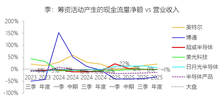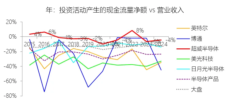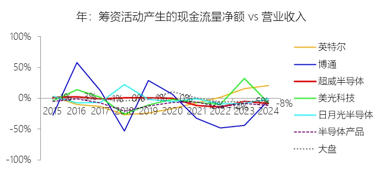 投资活动产生的现金流量净额:2025年,超威半导体的投资活动产生的现金流量净额为-55.33亿美元,绝对值同比增长402.54%,与营业收入的比例为-15.97%,同比下降11.7个百分点;2015-2024年(十年),此项合计为-21.12亿美元,平均比例为-1.69%,比半导体产品行业的均值高21.6个百分点,长期呈下降趋势。比例短期下降主要由于公司在2025年大幅度扩大了投资现金支出规模,其绝对值同比增长402.54%,远超同期营业收入34.34%的增速;具体而言,2025年公司用于购买短期投资的现金高达54.7亿美元,用于业务收购的现金净额为17.6亿美元(主要涉及ZT Systems的收购),且购建固定资产的支出也增加至9.74亿美元。尽管同年通过出售ZT制造业务给圣米娜(Sanmina)回笼了13.18亿美元现金,但由于前述支出项的激增,使得投资活动产生的现金流量净流出额显著扩大,拉低了其占营收的比例。比例长期下降主要由于公司财务策略从早期的“资产剥离与生存导向”转向了“扩张与战略投资导向”;在2015-2016年期间,公司通过出售ATMP业务多数股权等方式获得了显著的现金流入以充实资产负债表,使得当时的投资现金流比例相对较高(甚至为正);而随着营收以23.04%的年复合增速长期上升,公司开始利用充裕的现金流进行一系列战略并购(如Pensando、Silo AI等)并频繁买卖短期投资工具以管理流动性,导致投资活动净支出在长期内随业务规模同步扩大,比例呈回落趋势。比例高于半导体产品行业的均值主要由于AMD采取代工(Fabless)经营模式,其资本开支(CapEx)占营收的比重长期维持在极低水平,无需像英特尔等IDM模式竞争对手那样耗费巨资投建晶圆厂;此外,公司在2022年对赛灵思(Xilinx)的近500亿美元并购主要通过股权融资而非现金支付完成,这避免了巨大的投资性现金流出,且当时还一并收购了赛灵思账面约24亿美元的现金余额;这种轻资产运营模式以及历史上多次战略性资产出售带来的现金流入,共同导致其投资活动产生的现金流出强度显著低于重资产运行的行业均值。