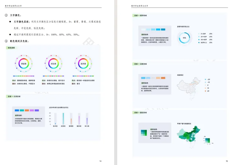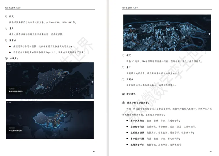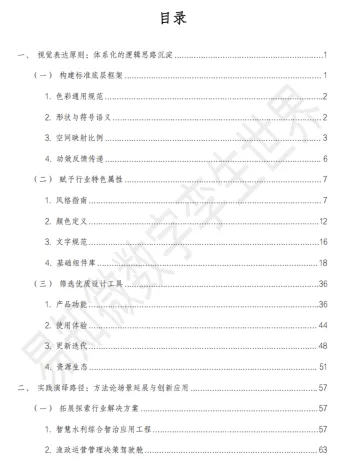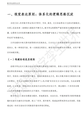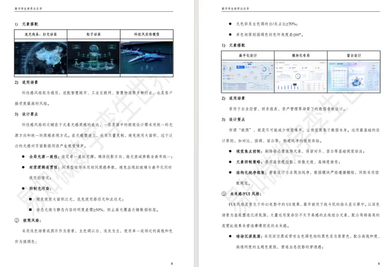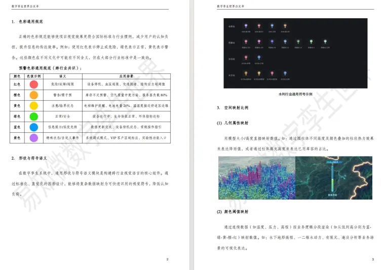 本章节是数字孪生视觉设计的底层框架,核心是实现理性数据与感性设计的平衡。1. 构建标准底层框架,明确色彩通用规范、形状与符号语义,通过几何、颜色阈值等五种空间映射比例实现数据可视化,同时规范功能型动效时长与三维镜头切换要素。2. 赋予行业特色属性,划分科技感、极简等四种设计风格,结合行业基因与品牌色定义配色,规范文字字体、字号等要求,搭建可复用的基础组件库并明确建设流程。3. 筛选优质设计工具,从产品功能、使用体验、更新迭代、资源生态四大维度给出选型标准。