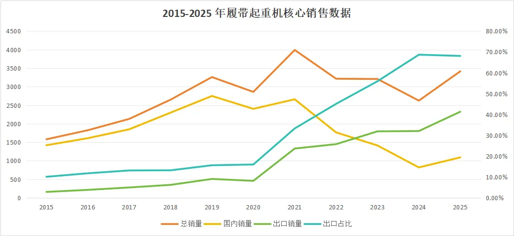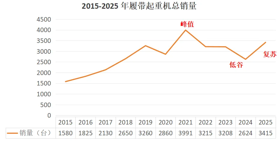当工程机械行业的 “黄金时代” 逐渐褪去,履带起重机作为高端装备领域的核心品类,过去十余年的发展轨迹,堪称一部行业转型的缩影。近日,中国工程机械工业协会最新发布 2025 年履带起重机销售数据,结合 2015-2024 年十年月度销售明细梳理发现:从 2015 年的 1580 台全年销量,到 2021 年峰值 3991 台,再到 2024 年回落至 2624 台,2025 年再度回升至 3415 台;从国内市场主导,到出口占比突破 68% 并持续稳居高位,这十余年,履带起重机行业经历了高速增长、深度调整、触底反弹,最终在内外协同中,走出了一条 “出口稳增长、国内迎复苏” 的全新发展之路。今天,我们就透过这份跨越十余年的销售数据,拆解行业发展的底层逻辑,读懂中国履带起重机的生存现状与未来机遇。十年数据复盘:四个阶段,从单极增长到双轮驱动