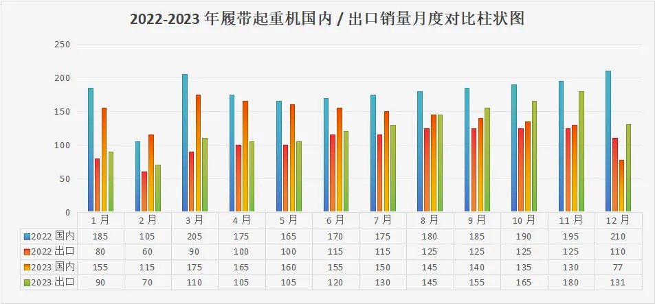 这七年,是履带起重机行业的 “野蛮生长” 期,核心驱动力来自国内基建投资的持续发力和房地产行业的高速发展。从数据来看,2015 年全年总销量仅 1580 台,国内销量 1420 台,出口仅 160 台,出口占比仅 10.1%,国内市场几乎包揽了所有需求。此后逐年攀升,2021 年达到近十余年峰值 —— 全年总销量 3991 台,同比增长 39.5%,其中国内销量 2660 台,虽仍占主导,但出口销量已飙升至 1331 台,同比增幅高达 190.6%,出口占比提升至 33.3%。月度数据更能体现行业热度:2021 年 9-12 月,单月销量连续突破 400 台,12 月更是达到 475 台,创下近十余年单月销量纪录。这一时期,无论是传统基建的桥梁、隧道工程,还是新能源领域的风电吊装,都对履带起重机形成了旺盛需求,国内主机厂快速扩产,市场呈现 “供不应求” 的态势。值得注意的是,这一阶段的出口市场已开始萌芽,尤其是 “一带一路” 倡议的推进,为中国履带起重机打开了东南亚、中东市场的大门,为后续的出口逆袭埋下了伏笔。第二阶段:2022-2023 年 深度调整期,出口成为 “救命稻草”
