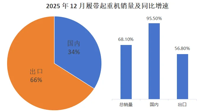 2025 年,履带起重机行业迎来全面复苏,成为十余年发展中的关键转折点。据中国工程机械工业协会统计,2025 年全年共销售履带起重机 3415 台,同比大幅增长 30.1%,结束了连续三年的销量下滑态势;其中国内市场迎来强势回暖,全年销量 1091 台,同比增长 32.9%,出口市场继续稳健增长,全年销量 2324 台,同比增长 28.9%,实现国内、出口双位数高增。年末收官数据更显亮眼:2025 年 12 月单月销售 385 台,同比增长 68.1%,其中国内销量 131 台,同比暴涨 95.5%,出口销量 254 台,同比增长 56.8%,单月数据的大幅攀升,印证了行业复苏的强劲动力,也为行业未来发展奠定了坚实基础。