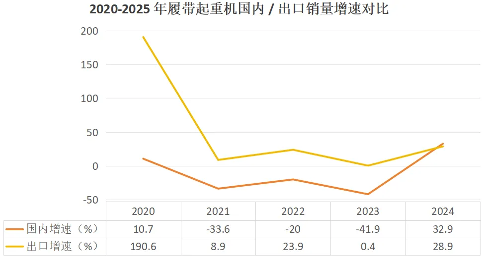 过去十年,国内履带起重机的需求主要依赖房地产和传统基建,但随着房地产行业进入 “存量时代”,传统基建投资增速放缓,2022 年后国内销量连续三年大幅下滑。但需求并非完全消失,而是发生了结构性转移:风电、核电等新能源工程,以及城市更新、地下管廊等新型基建,成为国内市场的核心需求点。尤其是大吨位、超大吨位履带起重机,在风电吊装领域需求逆势增长,2024 年 1000 吨级以上机型 83.6% 流向风电领域,海上风电占比达 57.2%,成为高端机型的核心应用场景。2025 年国内市场的强势复苏,更是得益于政策发力与需求释放的双重驱动:国内新型基建投资持续加码,风电、光伏等新能源项目开工率大幅提升,房地产保交楼及城市更新项目稳步推进,带动履带起重机需求持续释放,而主机厂针对国内市场的产品高端化、定制化布局,也进一步匹配了市场需求,推动国内销量触底反弹。逻辑二:出口逆袭,从 “被动支撑” 到 “主动引领”,成为基本盘