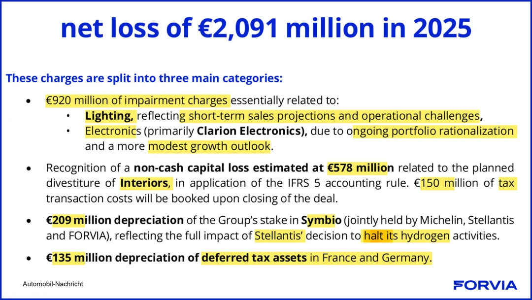 回顾2025年,受欧元汇率走强的不利影响,佛瑞亚销售额小幅下滑。得益于裁员和降本的收益,集团营业利润有所增长。集团净现金流十分充沛,净债务显著减少:然而,佛瑞亚新任CEO、原采埃孚集团高管 Martin Fischer先生对集团的业绩并不满意:因为,整个集团去年净亏损高达21亿欧!对此,以CEO为代表的佛瑞亚管理层提议股东们放弃2025年度分红。究其原因,主要是新CEO主动扒掉前任Patrick Koller时代鲜亮的外衣,将集团的老底切切实实地暴露在股东和投资人面前!这亏损的21亿欧里暴露的问题如下:- 歌乐电子和照明商誉减值9.20亿欧,这两块业务面临产品增长乏力及经营困境,为后续潜在交易做铺垫。