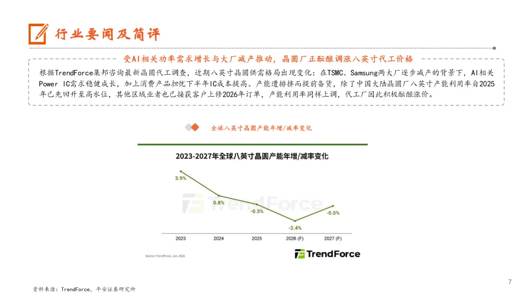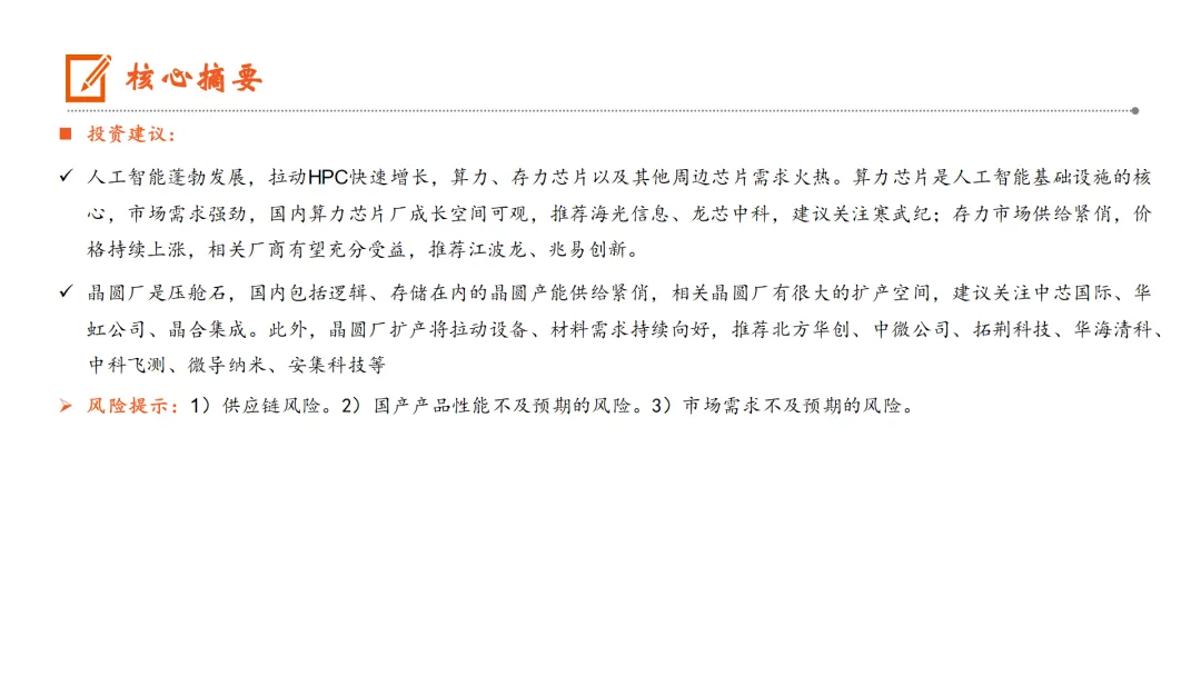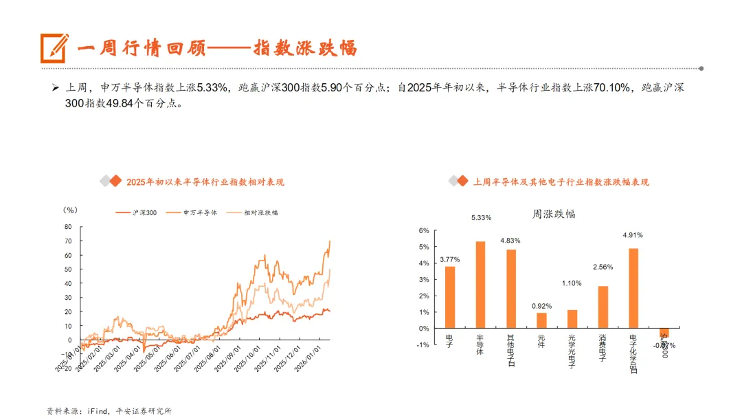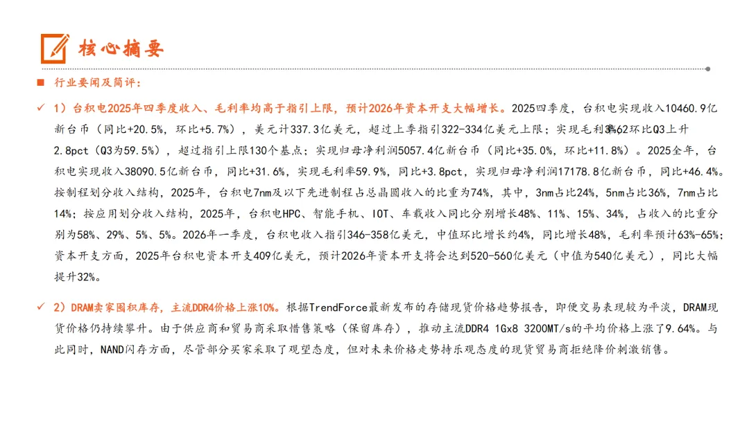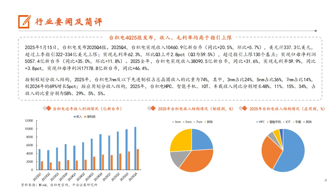 本篇行业报告可以通过扫下方知识星球下载。39元就可以下载星球所有报告。免费提供报告查找服务。全球半导体巨头台积电近日发布了2025年四季度的财务报告,业绩表现超出市场预期。报告显示,台积电四季度实现收入10460.9亿新台币,同比增长20.5%,环比增长5.7%,美元计收入为337.3亿美元,超出了此前的指引上限。毛利率达到62.3%,同比增长2.8个百分点,归母净利润为5057.4亿新台币,同比增长35.0%。在制程技术方面,台积电7nm及以下先进制程技术占总晶圆收入的比重高达74%,其中3nm技术占比24%,5nm占比36%,7nm占比14%。按应用划分,2025年台积电的HPC(高性能计算)、智能手机、IOT(物联网)、车载收入同比分别增长48%、11%、15%、34%,占收入的比重分别为58%、29%、5%、5%。展望2026年,台积电预计资本开支将达到520-560亿美元,同比大幅增长32%。其中,70-80%将分配给先进制程技术,10%分配给特种技术,10%-20%分配给先进封装、测试、掩膜制造等。这一资本开支的大幅增长预示着台积电将进一步扩大先进制程技术的产能,以满足市场需求。平安证券研究所电子信息团队对此表示,人工智能的蓬勃发展正在拉动HPC快速增长,算力、存力芯片以及其他周边芯片需求火热。他们推荐关注国内算力芯片厂如海光信息、龙芯中科,并建议关注寒武纪;同时,存力市场供给紧俏,价格持续上涨,相关厂商如江波龙、兆易创新有望充分受益。此外,晶圆厂作为半导体产业的压舱石,国内晶圆产能供给紧俏,相关晶圆厂如中芯国际、华虹公司、晶合集成有很大的扩产空间。晶圆厂的扩产将进一步拉动设备、材料需求,推荐关注北方华创、中微公司等。尽管市场前景看好,但平安证券也提醒投资者注意供应链风险、国产产品性能不及预期的风险以及市场需求不及预期的风险。在全球科技产业竞争激烈的背景下,这些因素可能会对半导体行业的未来发展造成影响。免责声明:以上分享报告为公开合法渠道获得,内容大部分来源于网络,版权归原作者所有,如有侵权,请及时与我们联系,我们将第一时间保障您的权益。推荐内容仅供参考学习,不构成投资建议。