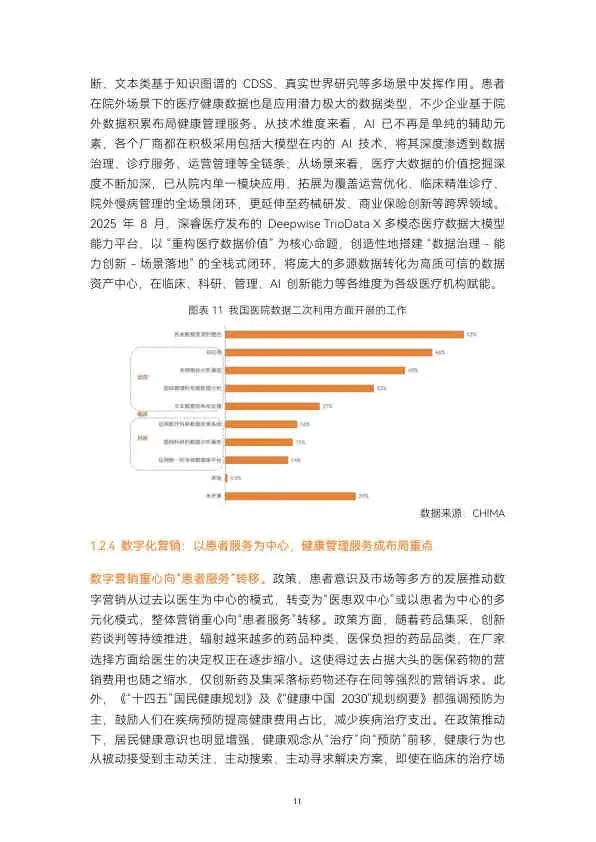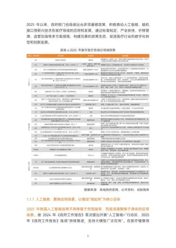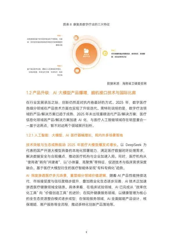 - AI大模型: 国产开源模型(如DeepSeek)大幅降低研发门槛,推动300余款医疗大模型涌现,呈现“专科专病化”和“医院共建”趋势。