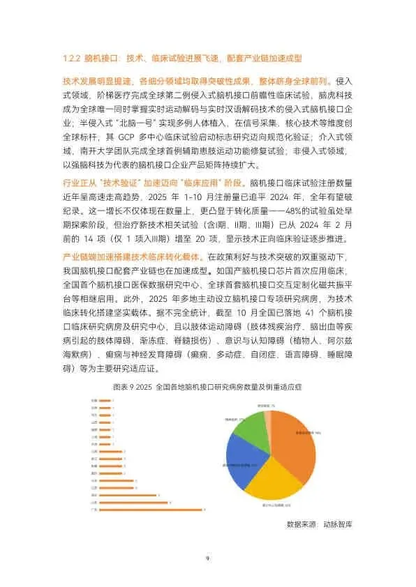- 脑机接口: 临床试验数量激增,阶梯医疗、脑虎科技、北脑一号等在侵入式、半侵入式领域取得多项全球首例或领先成果,配套产业链(芯片、研究病房)加速成型。