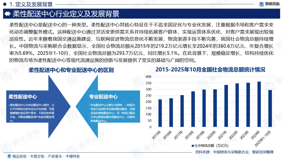 发展背景:物流业在国民经济中的基础作用是实现商品流通,是国民经济发展中的关键环节之一,现代物流业是国民经济中的动脉系统,连接社会经济的各个部分并使之成为一个有机整体。近年来随着我国交通设施建设,互联网促进物流信息化不断发展,物流渠道手段不断完善,我国社会物流总额持续增长。中国物流与采购联合会数据显示,全国社会物流总额从2015年的219.2万亿元增长至2024年的360.6万亿元,年复合增长率为5.69%。2025年1-10月,全国社会物流总额为293.7万亿元,同比增长5.1%。在此背景下,规模稳定增长、结构持续优化的物流市场为柔性配送中心等现代流通设施的创新与发展提供了坚实的基础与广阔的空间。