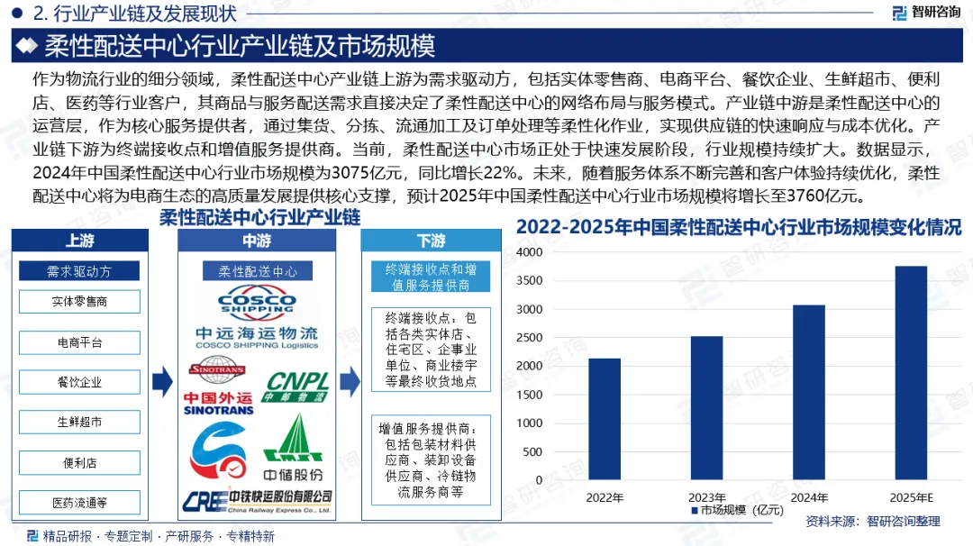 产业链核心节点:作为物流行业的细分领域,柔性配送中心产业链上游为需求驱动方,包括实体零售商、电商平台、餐饮企业、生鲜超市、便利店、医药等行业客户,其商品与服务配送需求直接决定了柔性配送中心的网络布局与服务模式。产业链中游是柔性配送中心的运营层,作为核心服务提供者,通过集货、分拣、流通加工及订单处理等柔性化作业,实现供应链的快速响应与成本优化,其主体包括第三方物流企业、供应链管理公司及企业自建物流体系。产业链下游为终端接收点和增值服务提供商,其中,终端接收点包括各类实体店、住宅区、企事业单位、商业楼宇等最终收货地点;增值服务提供商包括包装材料供应商、装卸设备供应商、冷链物流服务商等,为柔性配送中心提供辅助性服务。