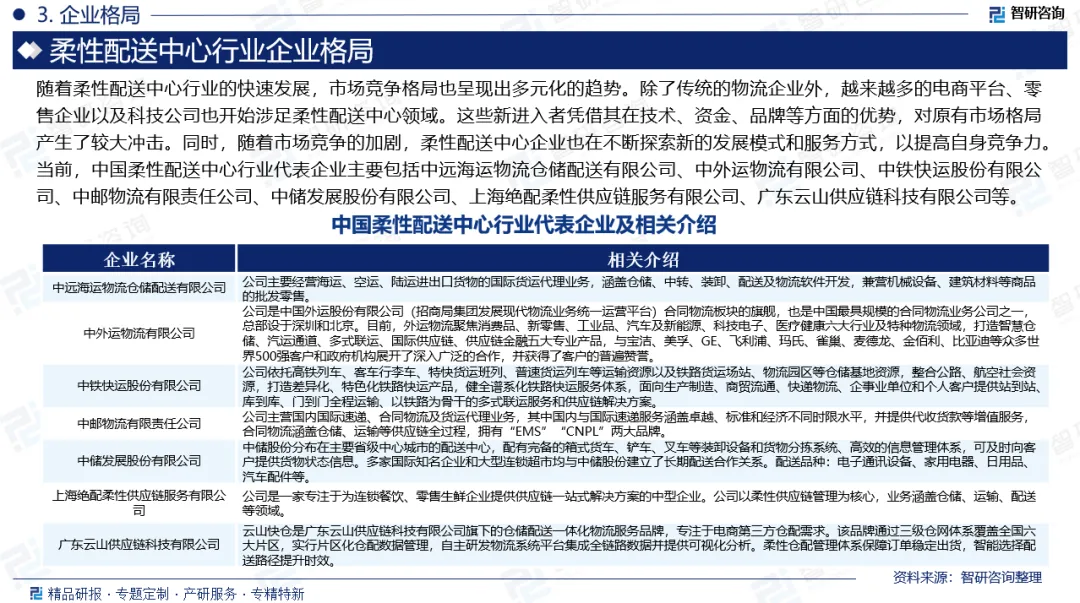 企业格局:随着柔性配送中心行业的快速发展,市场竞争格局也呈现出多元化的趋势。除了传统的物流企业外,越来越多的电商平台、零售企业以及科技公司也开始涉足柔性配送中心领域。这些新进入者凭借其在技术、资金、品牌等方面的优势,对原有市场格局产生了较大冲击。同时,随着市场竞争的加剧,柔性配送中心企业也在不断探索新的发展模式和服务方式,以提高自身竞争力。当前,中国柔性配送中心行业代表企业主要包括中远海运物流仓储配送有限公司、中外运物流有限公司、中铁快运股份有限公司、中邮物流有限责任公司、中储发展股份有限公司、上海绝配柔性供应链服务有限公司、广东云山供应链科技有限公司等。