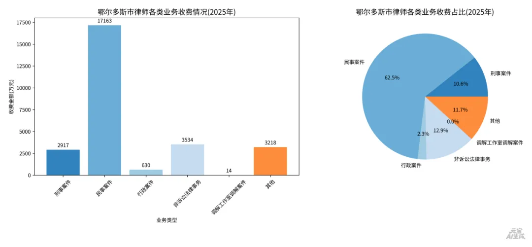 2025年鄂尔多斯市律师总收费额约2.75亿元,其中民事案件收费达17164万元,占比最高,体现出民商事业务是律师行业的主要收入来源。非诉讼法律事务收费为3534万元,显示非诉业务亦具有较强创收能力。刑事案件、行政案件收费分别占比相对较低,调解工作室收费规模较小。整体来看,律师行业收入结构呈现以民事业务为核心、非诉业务为辅的多元化格局。