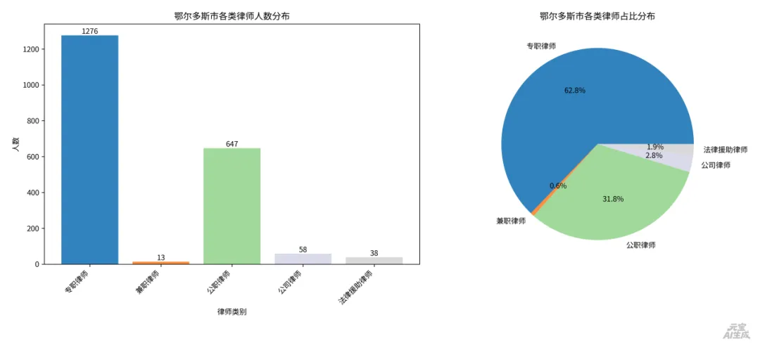 鄂尔多斯市律师结构以专职律师为主体,共1276人,占总人数的62.80%;公职律师为重要组成部分,占比31.84%。其余类型律师占比较低,兼职律师占0.64%,体现出律师队伍以全职执业和公职服务为主的基本格局。