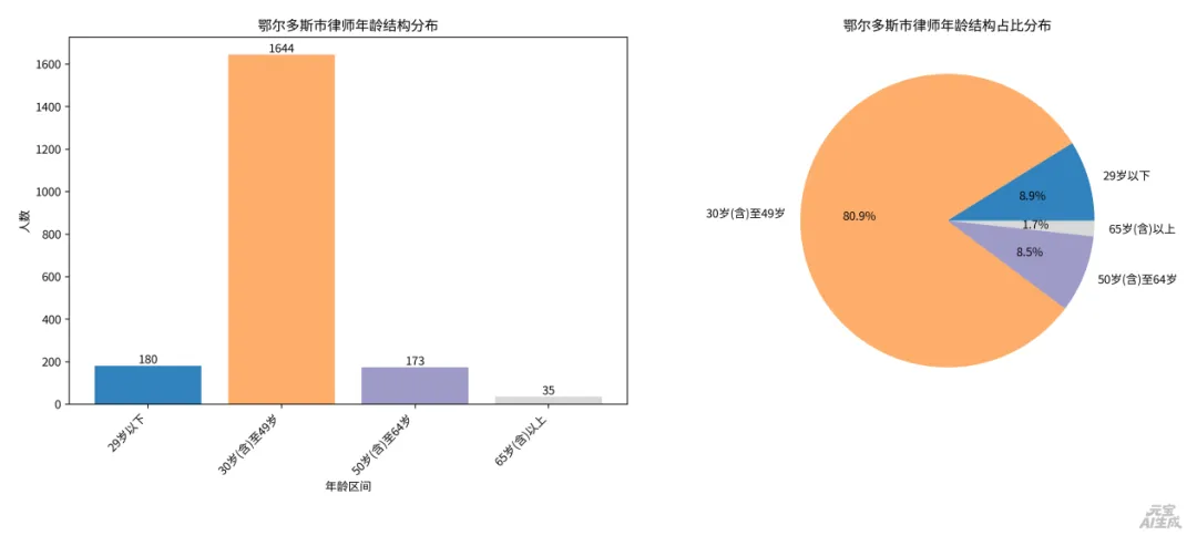 鄂尔多斯市律师年龄结构呈现明显的中青年化特征,30-49岁律师达1644人,占总数的80.91%,构成行业主力。青年(29岁以下)和中年(50-64岁)律师占比均不足9%,65岁以上律师仅占1.72%,反映出本市律师队伍整体较为年轻,职业发展处于黄金阶段。