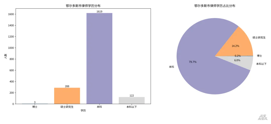 鄂尔多斯市律师学历以本科为主体,共1619人,占总数79.68%。硕士研究生占比14.17%,而博士学历仅3人,占比0.15%,显示高学历人才相对稀缺。整体队伍学历基础扎实,但高层次学历结构仍有提升空间。