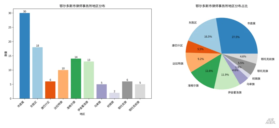 鄂尔多斯市律师事务所主要集聚于东康伊中心城区,共30家,占总数的27.52%,体现出较强的中心辐射效应。东胜区、准格尔旗、伊金霍洛旗的律师事务所数量也较为集中,占比均超过10%,共同构成地区法律服务网络的重要支点。其余旗区律师事务所数量相对较少,整体呈现以中心城区为核心、各旗区协同发展的分布格局。