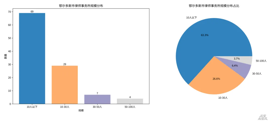 鄂尔多斯市律师事务所规模以中小型为主,10人以下律所达69家,占总数的63.30%,占绝对多数。10-30人规模律所29家,占比26.61%,构成了行业的中坚力量。30人以上规模律所仅11家,占比约10%,反映出本地律所整体呈现“小而精”的发展态势,规模化发展仍有成长空间。
