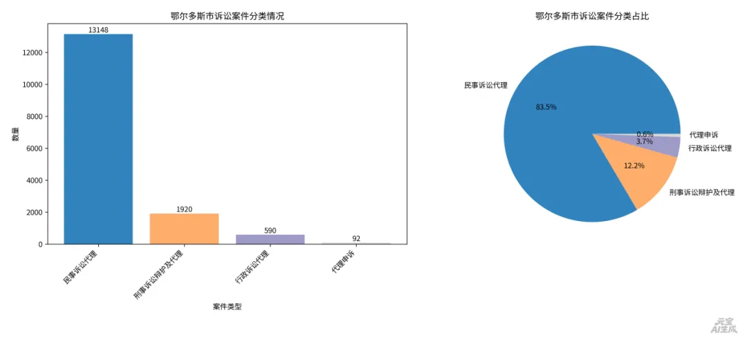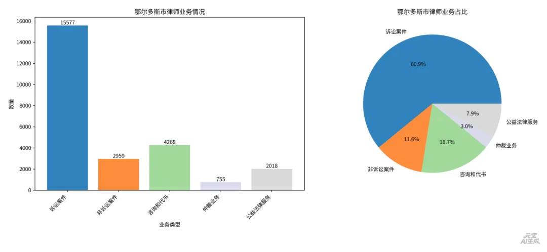 在诉讼业务领域中,民事诉讼代理表现突出,共办理13148件,占比83.48%,成为律师诉讼服务的主要内容。刑事诉讼和行政诉讼分别占比12.19%和3.75%,也在相应领域发挥了重要专业作用。整体来看,鄂尔多斯市律师诉讼业务结构以民商事领域为主,同时兼顾刑事、行政等多类型法律事务,展现出较为全面的专业服务能力。