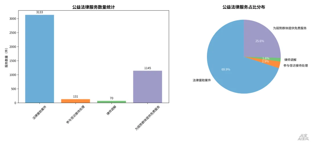 从业务结构看,法律援助和弱势群体服务构成了鄂尔多斯市公益法律服务的两大支柱,合计占比达95.51%,充分展现了律师行业在保障困难群众合法权益、促进社会公平正义方面的积极作用。法律援助案件的高比例表明,律师们不仅关注有偿业务发展,更将帮助经济困难群众获得优质法律服务作为行业的重要使命,切实履行了《法律援助法》赋予的法律援助职责。