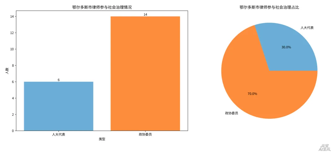 鄂尔多斯市律师积极参政议政,共有20名律师担任各级人大代表或政协委员,其中人大代表6名、政协委员14名,体现出律师行业在社会治理和政治参与中具有较高的活跃度与影响力。
