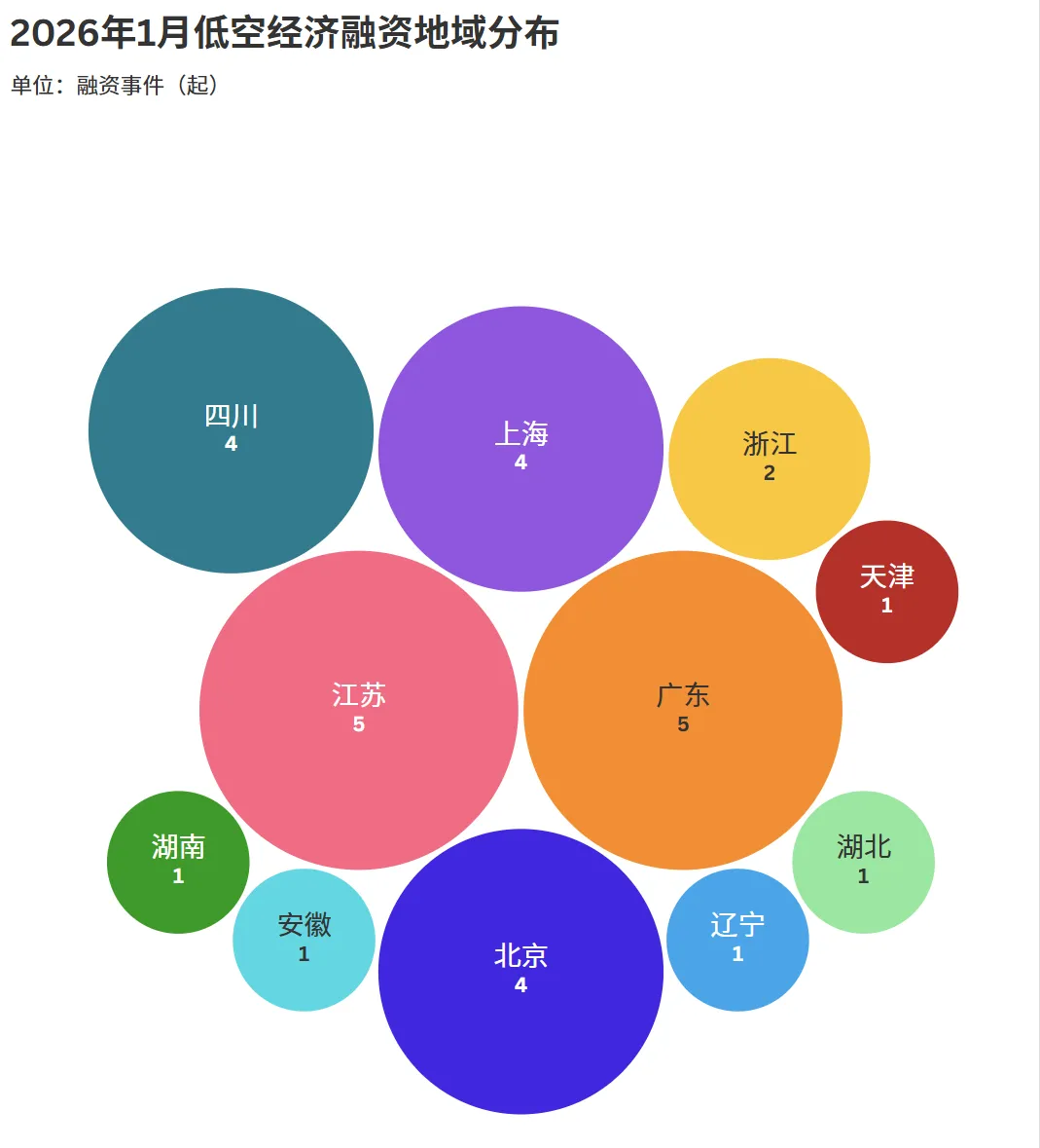 2026年1月,低空经济领域的融资活动呈现出区域集聚与多点开花并存的格局,江苏、广东两地以5起融资事件领跑全国,成为低空经济发展的核心引擎。