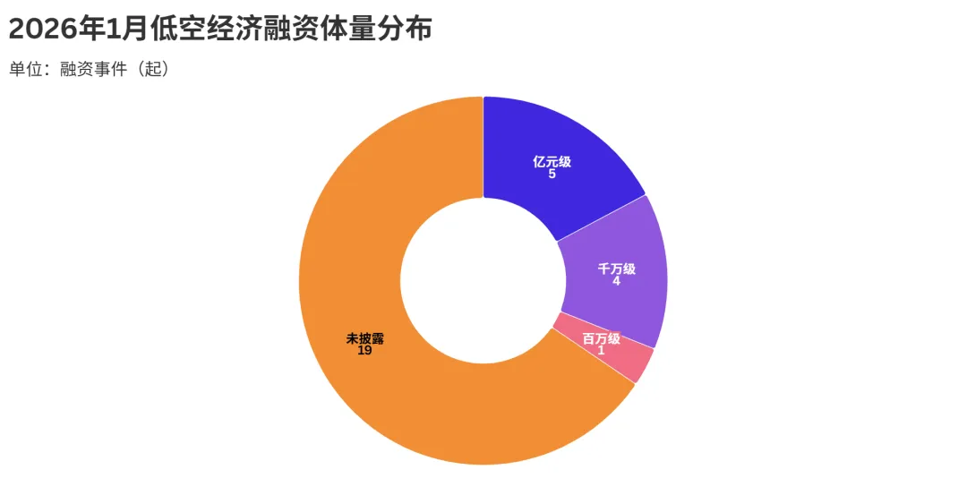 2026年1月,低空经济赛道的融资体量结构呈现出鲜明的分化特征,在披露金额的融资事件中,亿元级项目占比显著提升,显示出行业头部效应正在加速形成。