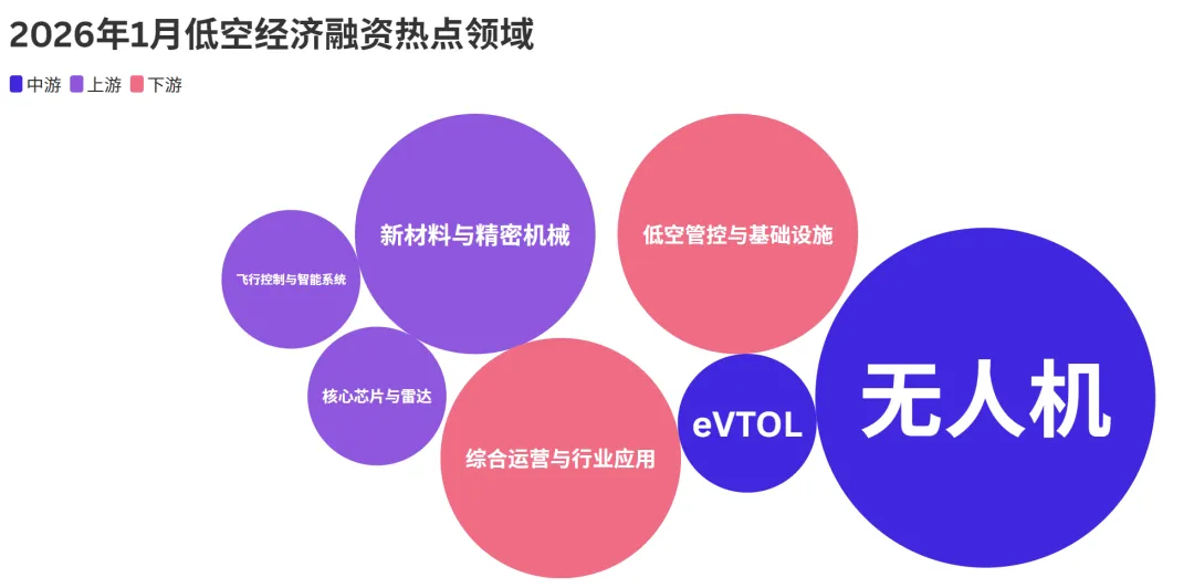2026年1月,低空经济赛道的融资热点呈现出全产业链覆盖、中游制造引领的鲜明格局。从气泡图的分布来看,中游的无人机与eVTOL(电动垂直起降飞行器)成为资本最集中的领域,同时上游核心技术与下游应用场景也同步升温,行业发展正从单点突破迈向协同共进。