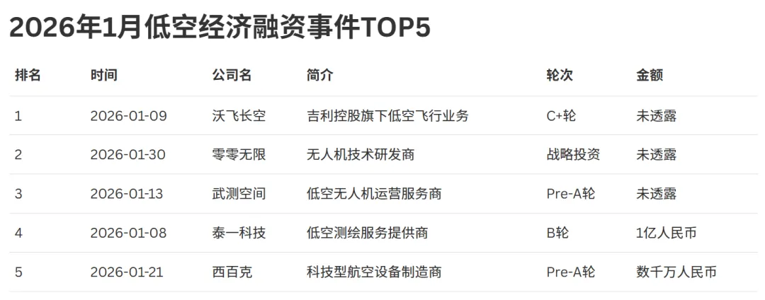 与此同时,千万级和百万级融资事件的存在,也说明行业中仍有大量创新型中小企业在细分赛道深耕,为行业的持续创新提供了活力。整体来看,2026年1月低空经济的融资体量分布,既体现了资本对头部企业的青睐,也展现了行业生态的多元性,为低空经济的高质量发展奠定了坚实基础。