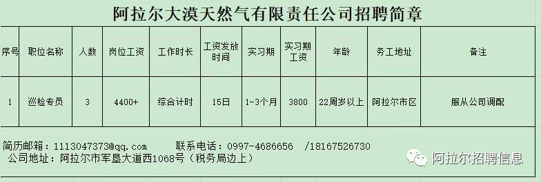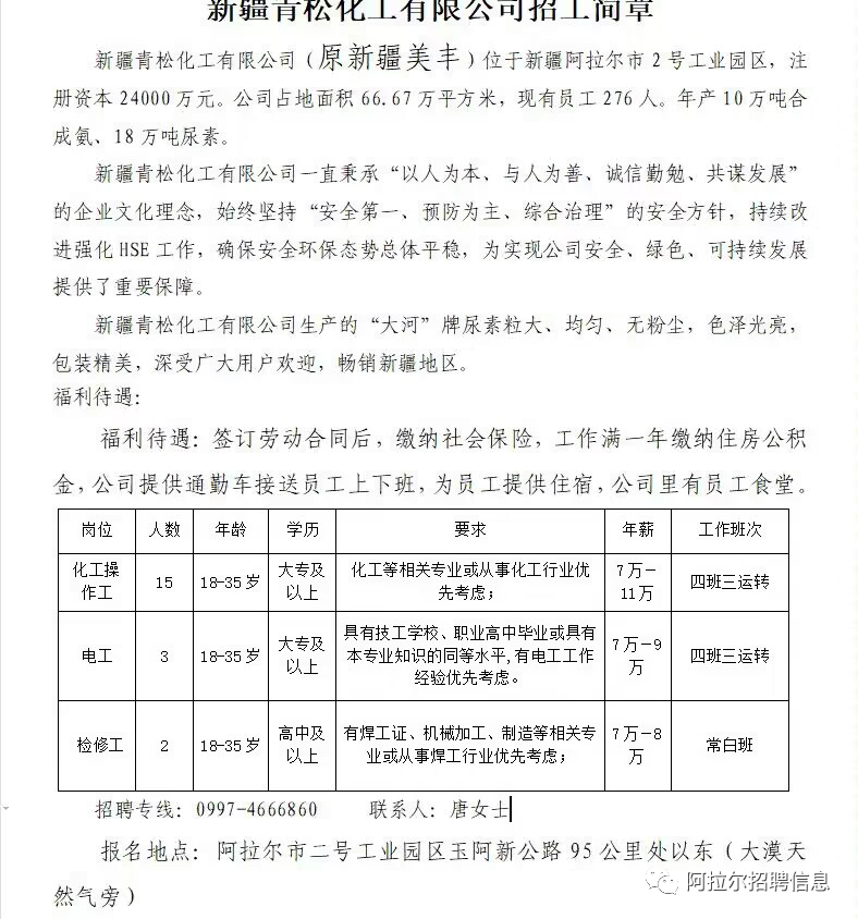 (三)招聘电话:0997-6869599 王女士(四)工作地点:新疆阿拉尔市二号工业园区