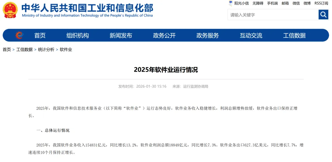 2025年软件业运行情况 2025年,我国软件和信息技术服务业(以下简称“软件业”)运行态势良好,软件业务收入稳健增长,利润总额增势放缓,软件业务出口保持正增长。 一、总体运行情况 2025年,我国软件业务收入154831亿元,同比增长13.2%。软件业利润总额18848亿元,同比增长7.3%。软件业务出口627.3亿美元,同比增长7.7%,增速连续10个月保持正增长。 二、分领域运行情况 软件产品收入稳定增长。2025年,软件产品收入32361亿元,同比增长10.4%,占全行业收入比重为20.9%。其中,基础软件产品收入2146亿元,同比增长11.1%;工业软件产品收入3330亿元,同比增长9.7%。 信息技术服务收入保持两位数增长。2025年,信息技术服务收入106366亿元,同比增长14.7%,占全行业收入的68.7%。其中,云计算、大数据服务共实现收入16230亿元,同比增长13.6%,占信息技术服务收入的15.3%;集成电路设计收入4421亿元,同比增长18.9%;电子商务平台技术服务收入14855亿元,同比增长12.7%。 信息安全收入和嵌入式系统软件收入平稳增长。2025年,信息安全产品和服务收入2235亿元,同比增长6.7%。嵌入式系统软件收入13869亿元,同比增长9.3%。 三、分地区运行情况 2025年,东部地区、中部地区、西部地区和东北地区软件业务收入分别同比增长13.6%、12.6%、10.5%和9.8%。东部地区软件业务收入占全国的83.1%。京津冀地区软件业务收入同比增长14.9%,长三角地区软件业务收入同比增长15.2%,两个地区软件业务收入在全国的占比分别为26.7%、28.9%。北京、广东、江苏、山东、上海软件业务收入居全国前5,同比分别增长15.3%、10.9%、14.4%、11.1%和22.0%。 |