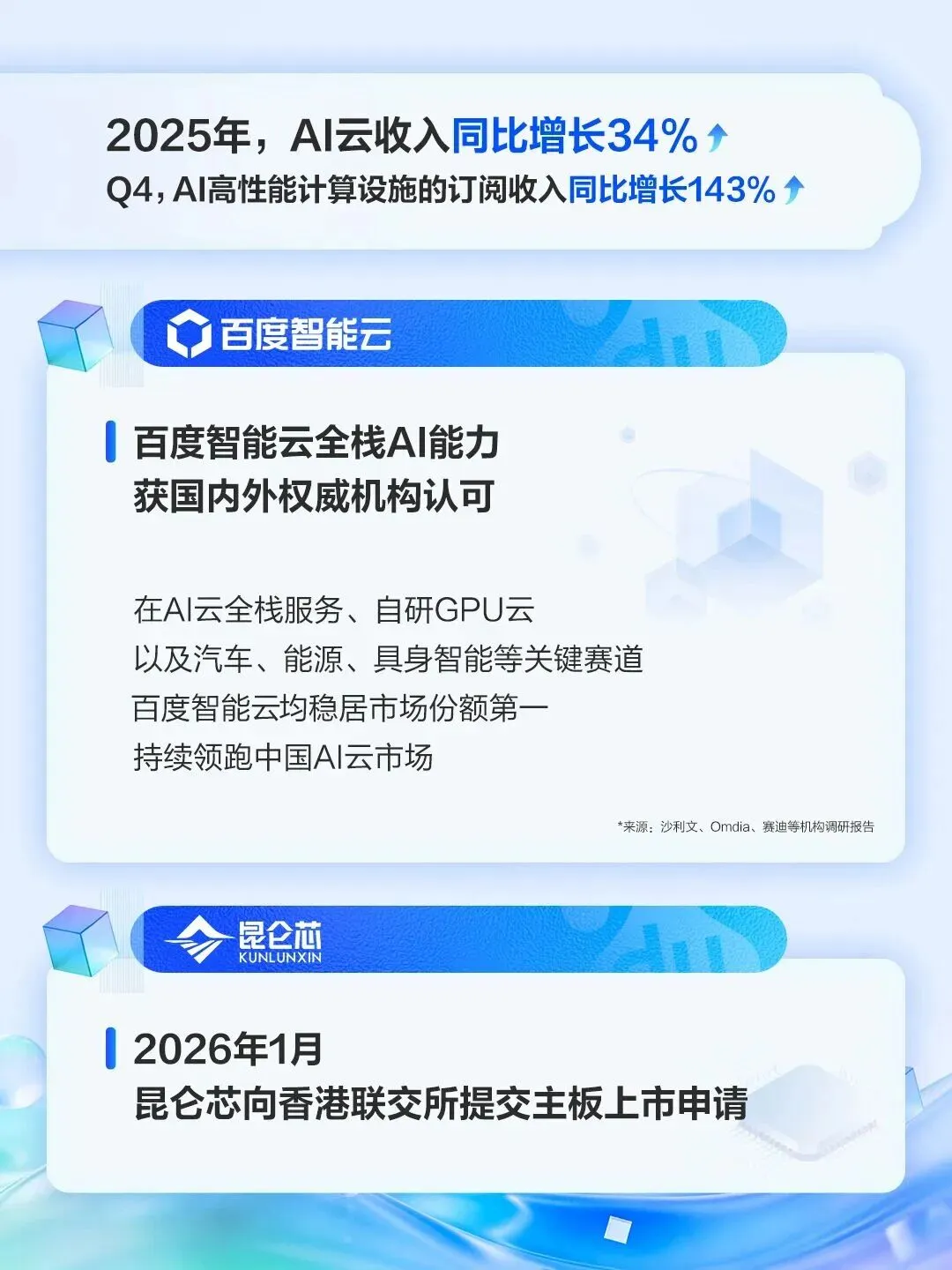 A:2025年百度AI云收入同比增长34%,增速快于行业整体水平,其中订阅制AI加速器基础设施收入同比增长约140%,成为最主要增长驱动力。核心增长原因包括:企业AI需求快速增长(训练与推理需求均上升);端到端AI架构形成差异化竞争优势;多芯片架构与统一调度能力提升算力效率;自研昆仑芯AI芯片提升性能与成本优势。