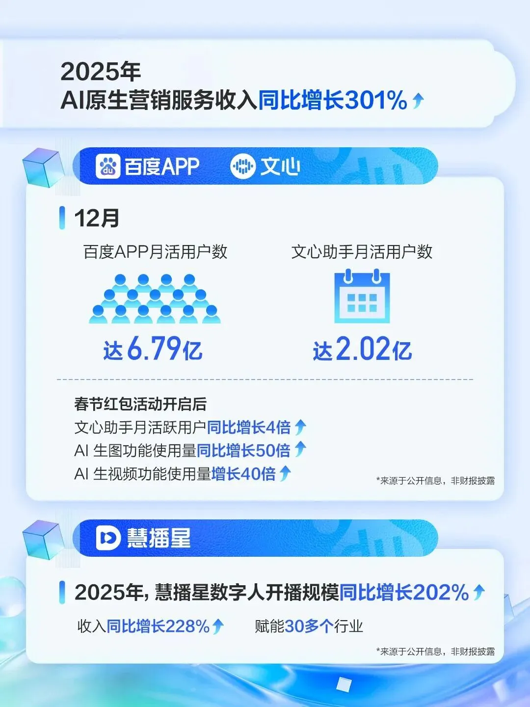 AI原生营销服务:2025年第四季度,AI原生营销服务收入达到人民币27亿元,同比增长110%;2025年12月,百度APP的月活跃用户达到679百万,同比持平;2025年12月,文心助手的月活跃用户达到202百万。