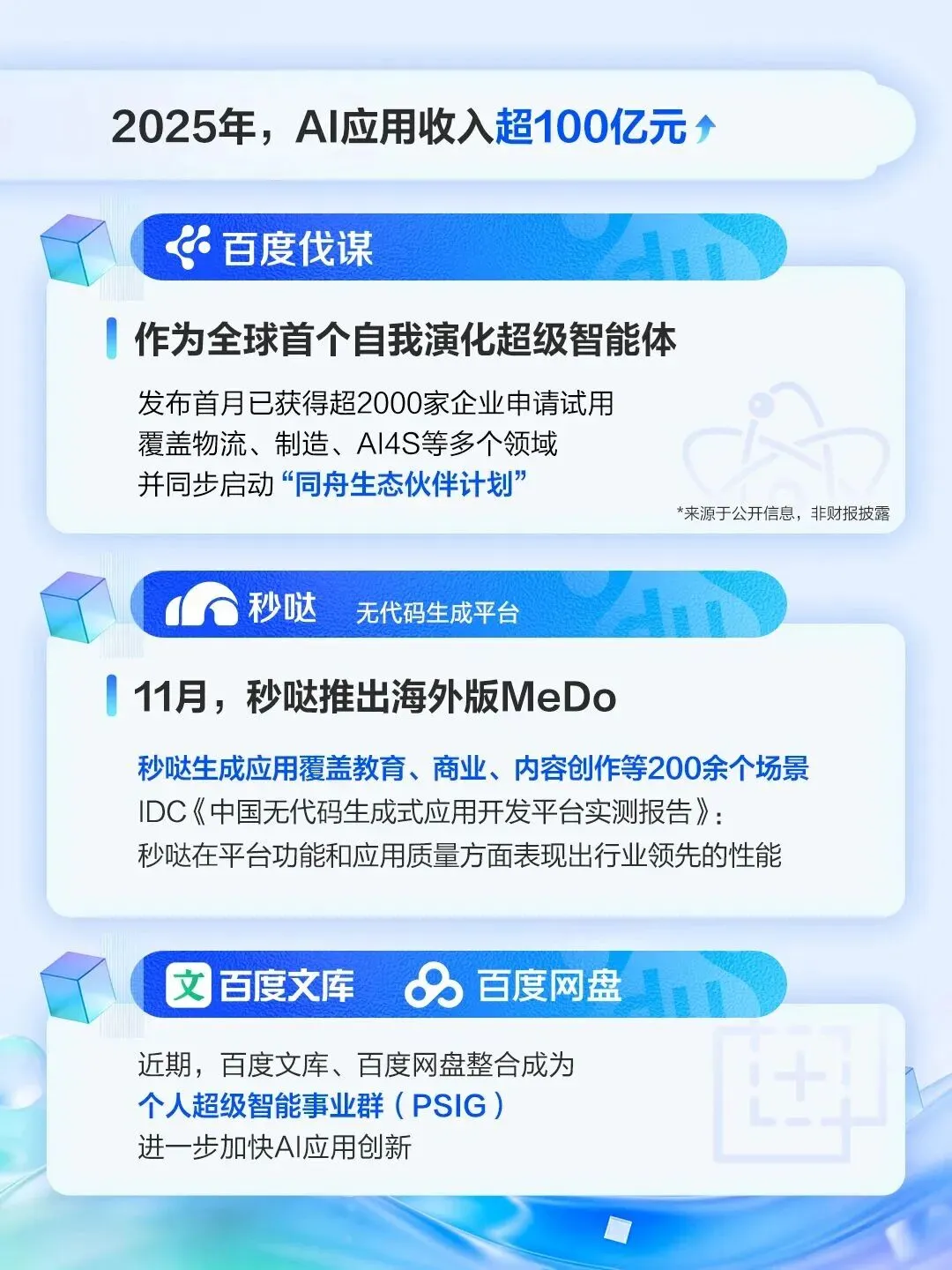 AI应用:2025年第四季度,AI应用收入为人民币27亿元,2025年全年收入超过人民币100亿元。根据IDC于2025年11月发布的《中国无代码生成式应用开发平台实测报告,2025》,百度的无代码编程平台秒哒在平台能力与应用质量方面展现行业领先的表现。百度成立个人超级智能事业群组(PSIG),将百度文库与百度网盘整合,以加速推动 AI应用创新。