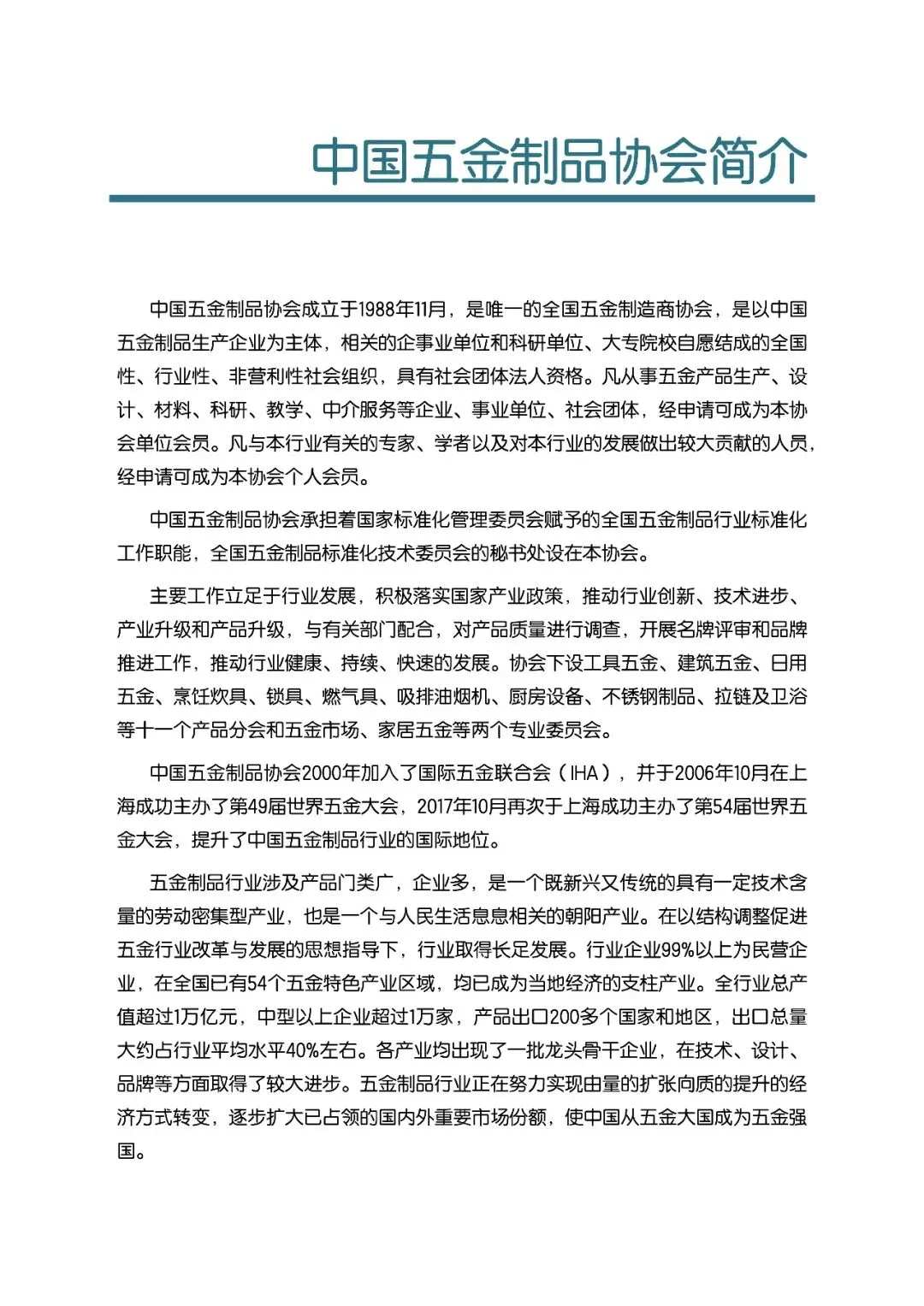 中国五金制品协会成立于1988年11月,是唯一的全国五金制造商协会,是以中国五金制品生产企业为主体,相关的企事业单位和科研单位、大专院校自愿结成的全国性、行业性、非营利性社会组织,具有社会团体法人资格。凡从事五金产品生产、设计、材料、科研、教学、中介服务等企业、事业单位、社会团体,经申请可成为本协会单位会员。凡与本行业有关的专家、学者以及对本行业的发展做出较大贡献的人员,经申请可成为本协会个人会员。