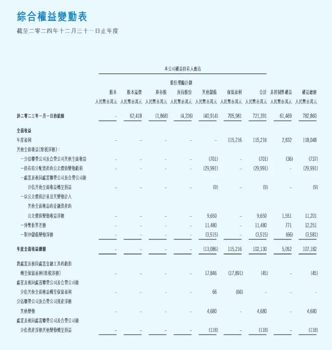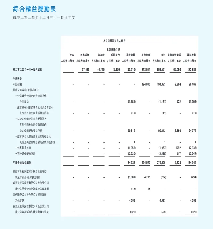 - 权益重分类:两年均有将其他全面收益转至留存收益的操作,2024 年金额为 2.34 亿元,2023 年为 178.46 亿元,差异源于处置资产的规模和性质。