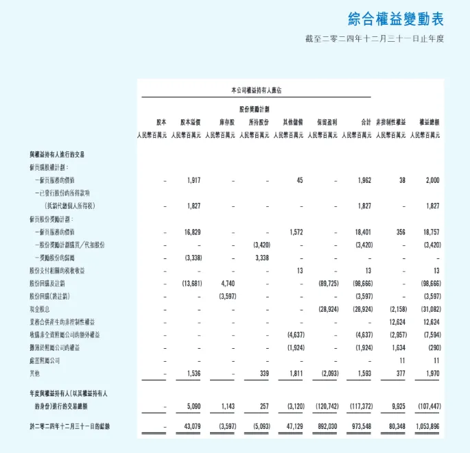 这一列是 “与权益持有人进行的交易”,它记录的是腾讯在 2024 年和股东之间发生的所有资金往来,核心是公司和股东之间 “分钱” 或 “回购股份” 的动作 。