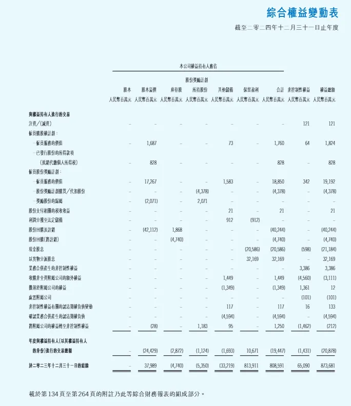 - 权益净变动:2024 年与权益持有人交易的净影响为 - 1074.47 亿元,2023 年为 - 208.78 亿元,2024 年股东权益减少更多,主要源于更慷慨的分红和回购。