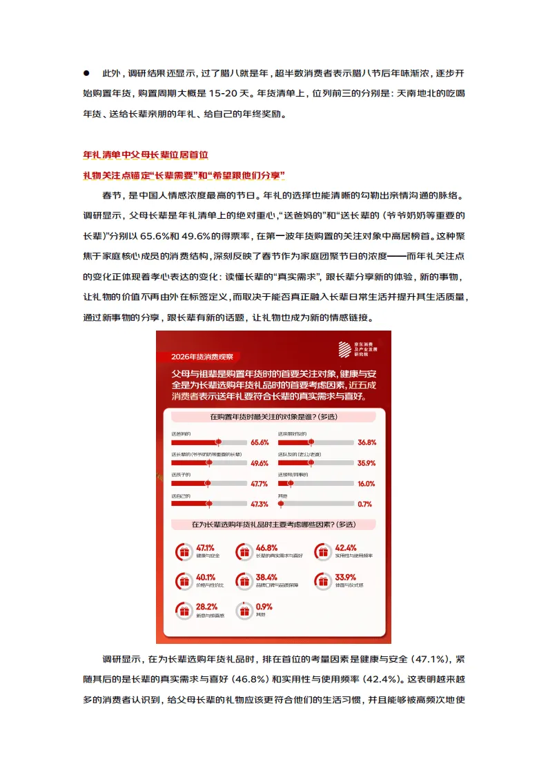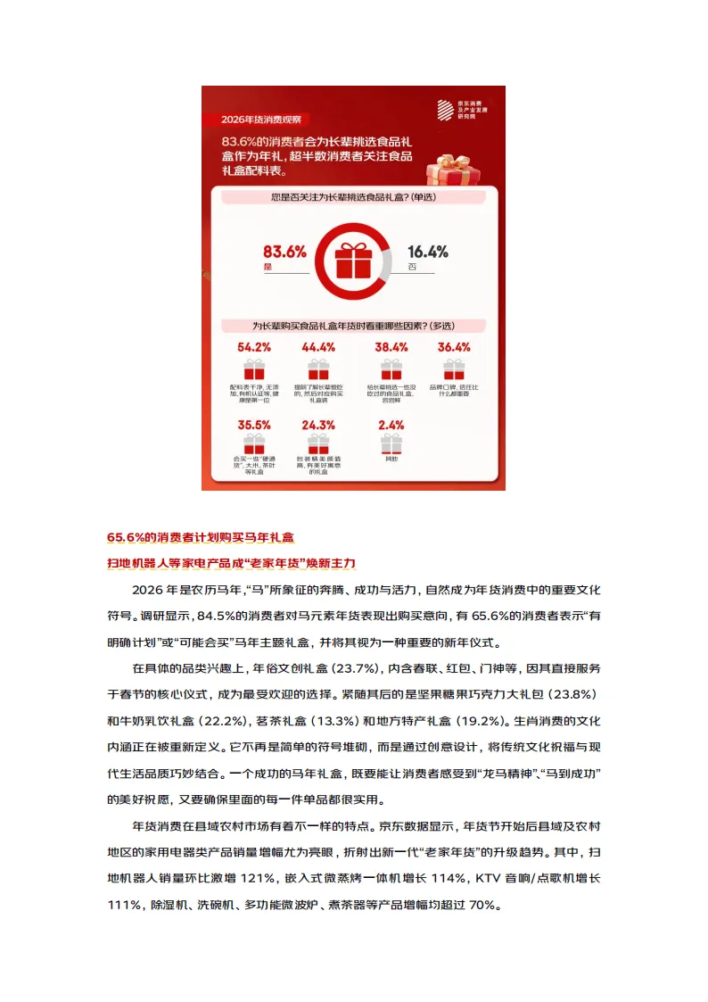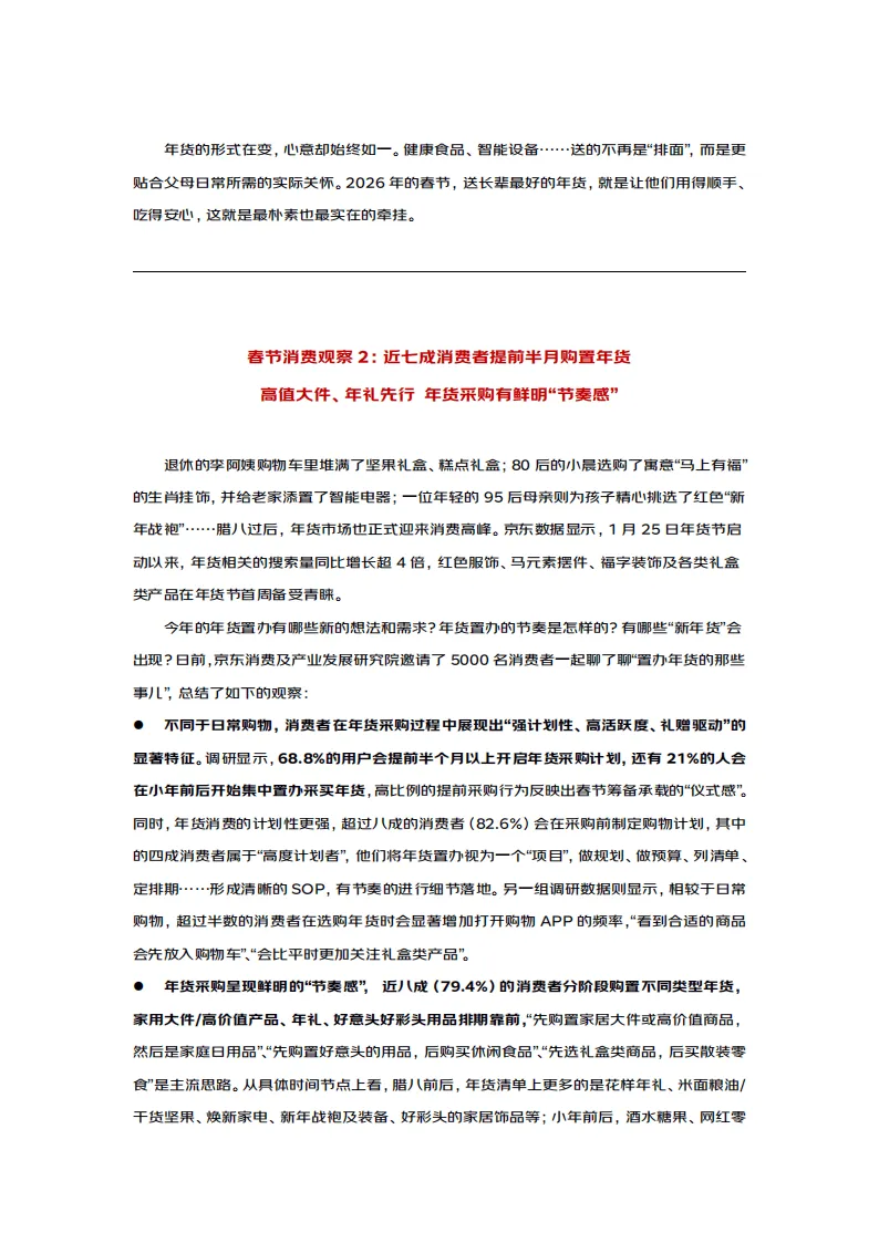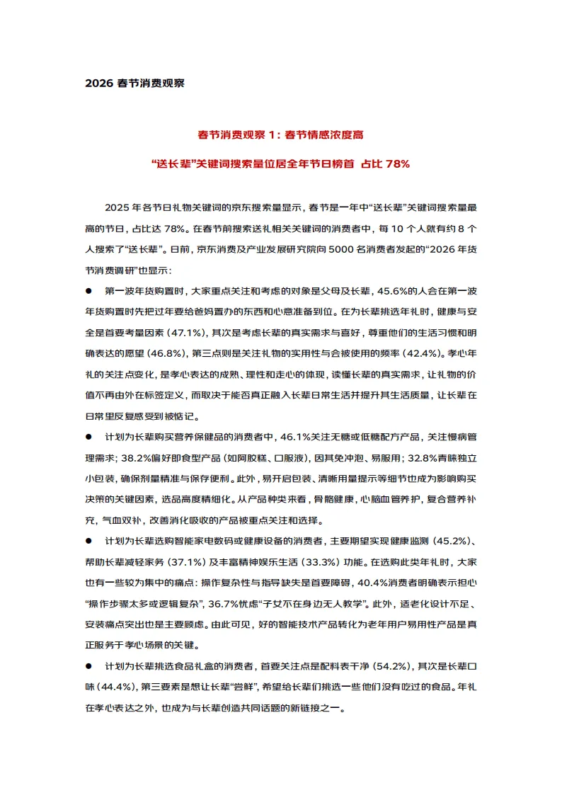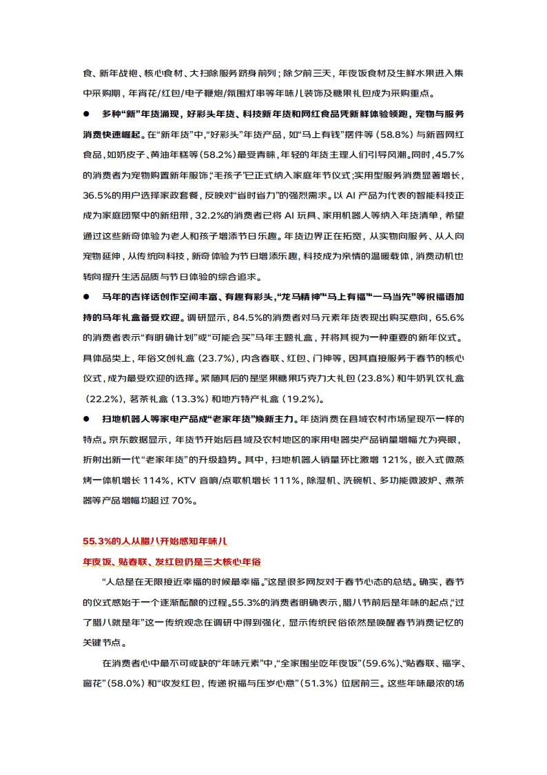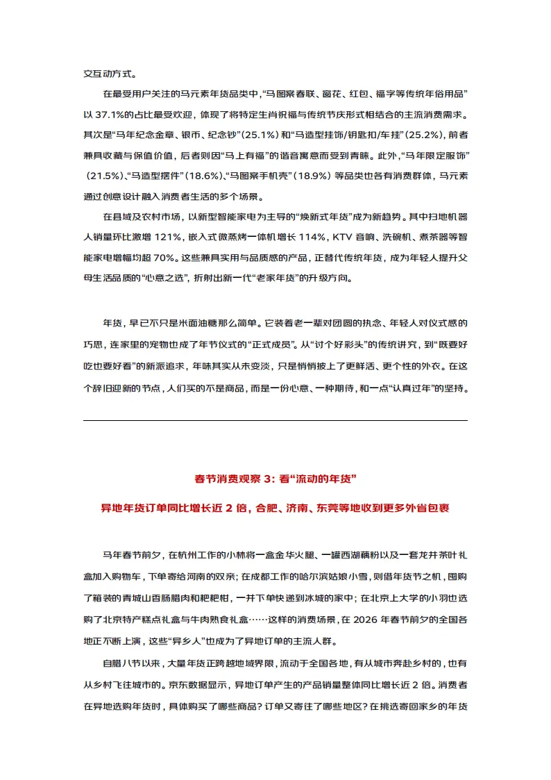 2026年马年春节消费呈现出情感浓度高、消费规划性强、品类多元创新、地域融合加深的鲜明特征,孝心消费理性化、年货选择品质化、过节方式多元化成为核心趋势,传统年俗与现代消费理念深度交融,年味表达更具时代特色。