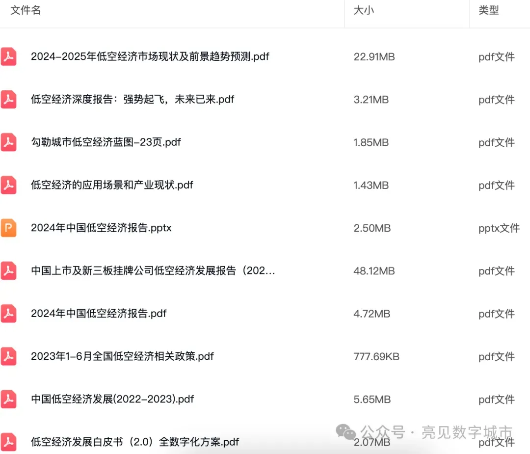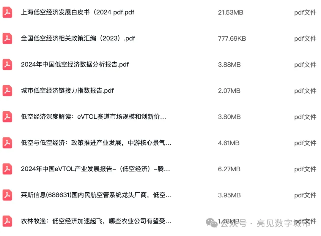 1、点击上方关注“亮见数字城市”公众号,公众号后台回复关键字:“低空经济产业资料参考”,免费获取介绍资料下载(仅限PDF文件)的答复。