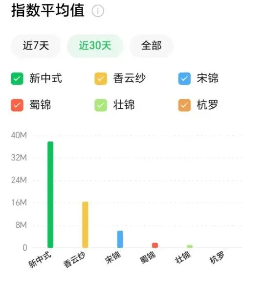 宋锦:指数均值位居第2,在2月上旬出现明显峰值,与春节前消费筹备期高度吻合,体现出其在高端礼品与服饰领域的强劲需求。