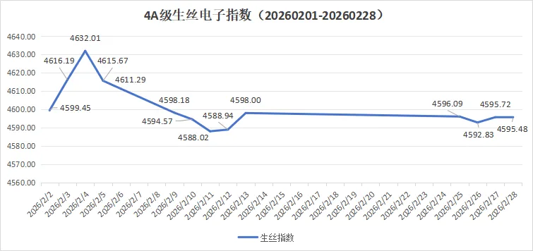 走势特征:2月初,在外围商品市场拉动和行业内节前备货等因素拉动下,生丝电子指数连续收出小阳线,推动生丝电子指数短期走强。随着节前备货周期逐步结束,2月6日后,价格指数连续小幅回调并进入窄幅震荡阶段;2月14日到24日休市交易暂停;25日复市后,电子指数延续弱势整理,反映出市场对节后需求复苏的谨慎预期,产业链库存消化节奏成为制约指数上行的核心因素。本月生丝电子指数收于4595.48点环比上月微涨0.01%。