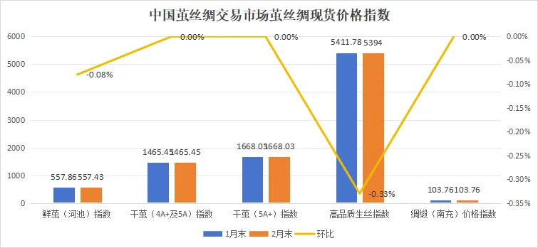 经历1月整体下跌后,2月茧丝绸现货价格指数跌幅显著收窄,价格走势受节前备货与企业去库行为共同影响。