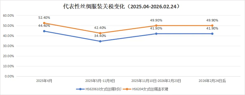 中国对美丝绸出口关税维持高位:美国全球关税新政落地后,我国丝绸服装关税未发生调整,301关税作为对华贸易限制核心工具仍未松动,关税劣势持续突出。