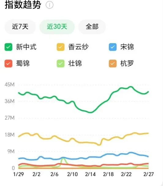 蜀锦、壮锦、杭罗:虽整体热度不及前两者,但在春节期间也出现了不同程度的热度抬升,反映出消费者对多元非遗丝绸品类的关注度的提升。同时,杭罗薄型面料因季节原因热度尚未提升。