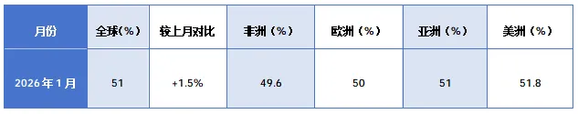 1月全球制造业PMI达51%,较上月提升1.5个百分点,各洲均保持扩张或接近扩张区间。