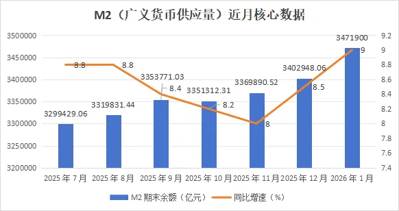图19:M2(广义货币供应量)近月核心数据(2025年7-12月数据来自国家统计局,2026年1月数据为央行金融统计报告,2026年2月M2数据预计于3月中旬公布)