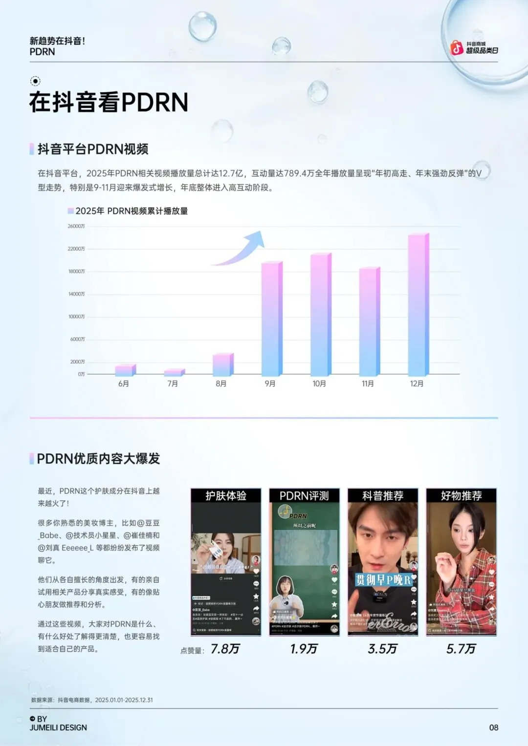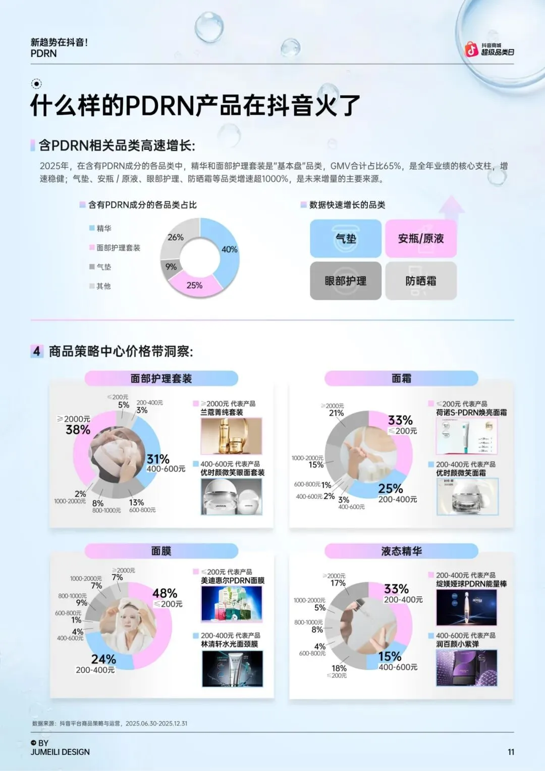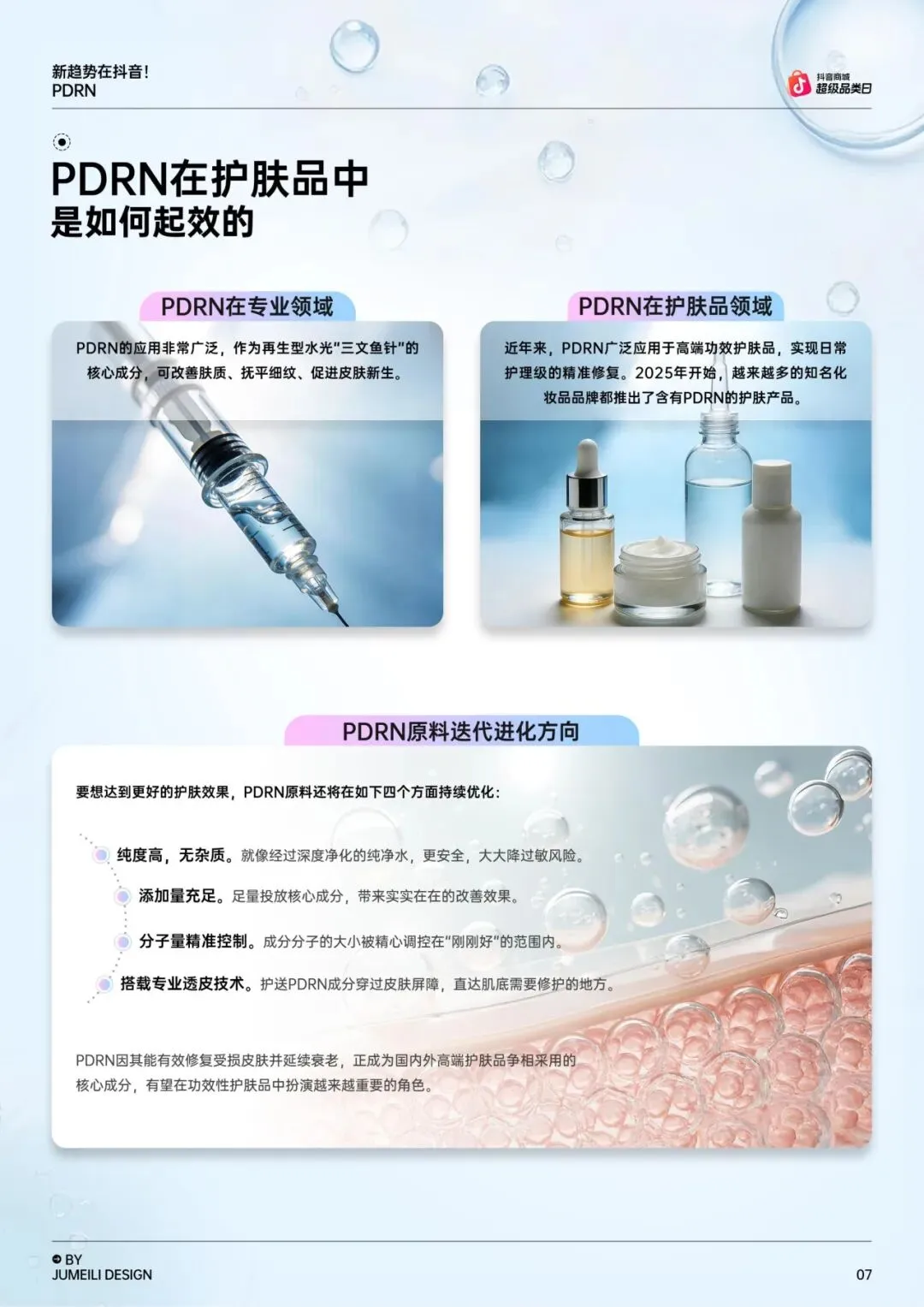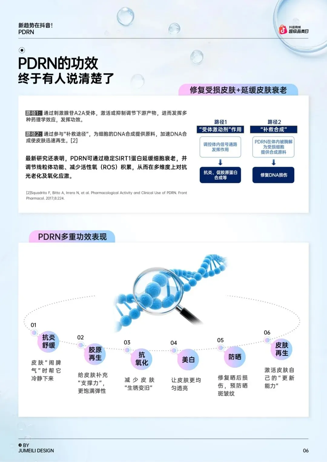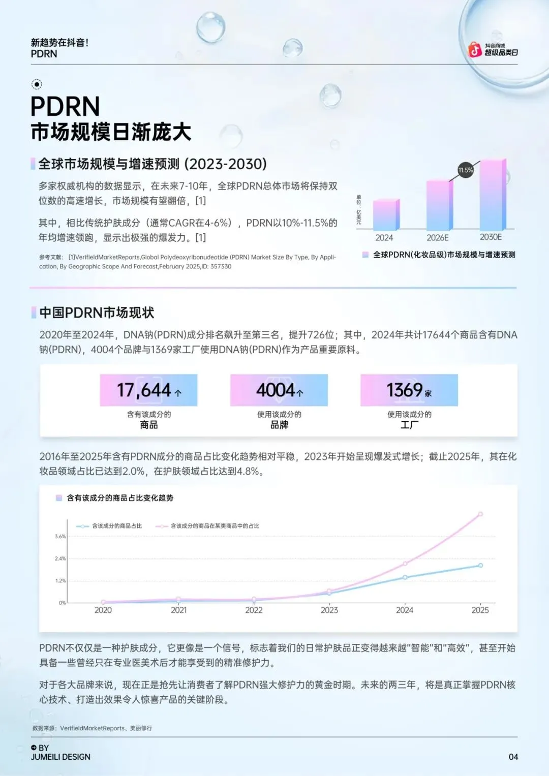 《PDRN趋势报告》首次全面呈现了PDRN赛道的爆发态势:全球范围内,化妆品级PDRN市场未来7-10年将保持10%-11.5%的双位数增速,远超传统护肤成分4-6%的平均水平;中国市场更显活力,2024年含PDRN成分的商品达17644个,品牌与工厂数量分别突破4000家和1300家,2025年其在护肤领域的占比已攀升至4.8%。